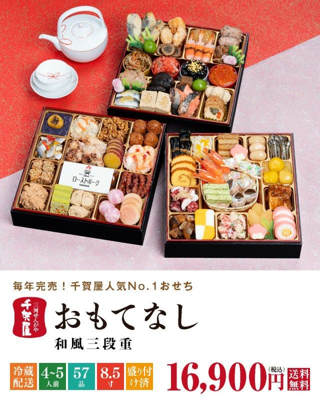 おもてなし参道は愛知県蒲郡市で創業五十余年の歴史をもつ名店「割烹料亭千賀」の料理長「千賀信明」が、素材から一品一品厳選しこだわり抜いた、 料亭千賀監修のおせち料理です。