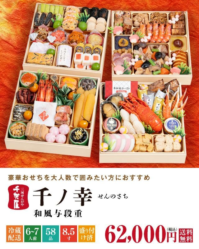 | 千ノ幸 | ![]() | 和風 | 6~7人 58品 | 8.5寸 4段 | 62,000円 |