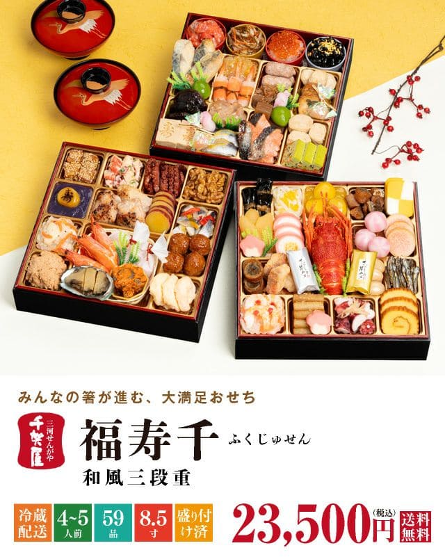 | 福寿千 | ![]() | 和風 | 4~5人 59品 | 8.5寸 3段 | 23,500円 |