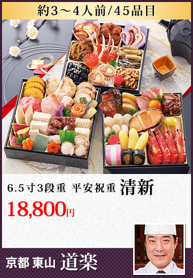 | 料亭道楽 「清新」 | ![]() | 3~4人 45品 | 6.5寸 3段重 | 18,800円 |