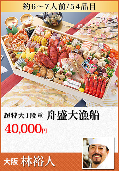 | 林裕人 「超特大宝船」 | ![]() | 4~5人 48品 | 特大 1段重 | 22,000円 |