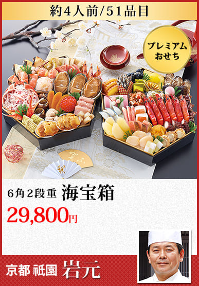 岩元おせち「海宝箱」は、京都祇園花見小路の人気料亭 岩本が監修した、人気海鮮食材がたっぷりつまった”海の幸おせち”です。